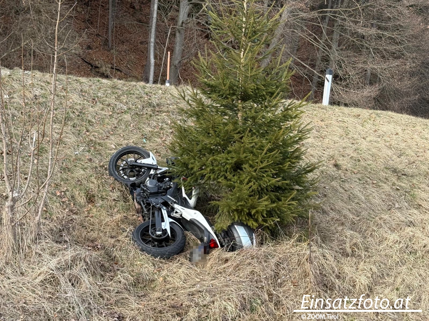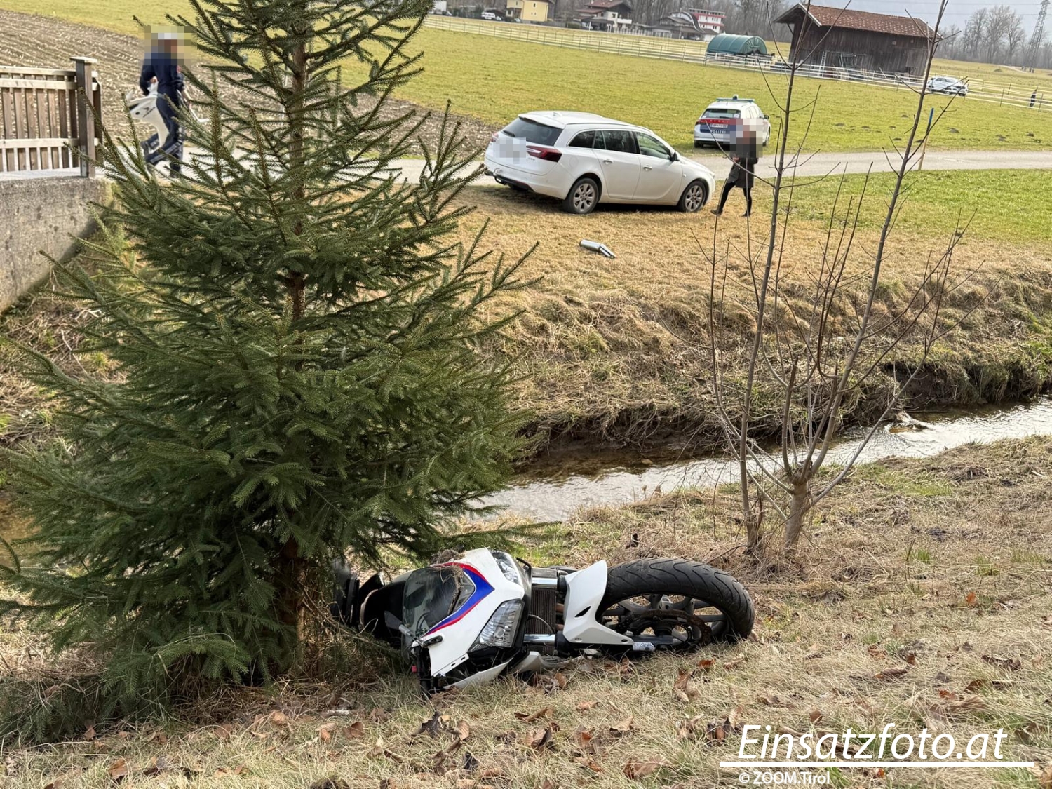 Am 08.03.2026, gegen 14.50 Uhr, lenkte eine 35-jährige Österreicherin einen PKW auf der L211 Unterinntalstraße, im Gemeindegebiet von Breitenbach am Inn, vom Ortsgebiet kommend in Richtung Reintalersee. Zur gleichen Zeit lenkte ein 31-jähriger ungarischer Staatsangehöriger ein Motorrad in selbe Fahrtrichtung. In weiterer Folge beabsichtigte die 35-Jährige, in eine links abzweigende Zufahrtsstraße einzubiegen. Zeitgleich wollte der 31-Jährige mit dem Motorrad den PKW und zwei davor fahrende Radfahrer überholen und setzte zum Überholvorgang an, dabei kam es zu einer Kollision mit dem PKW und dem Motorrad. Der 31-Jährige stürzte über den Fahrbahnrand bzw. eine abschüssige Böschung und kam schließlich in einem kleinen Bachbett zu liegen. Nach erfolgter Erstversorgung durch den verständigten Rettungsdienst wurde der Ungar mit Verletzungen unbestimmten Grades in das Bezirkskrankenhaus Kufstein eingeliefert. An beiden Fahrzeugen entstand erheblicher Sachschaden. Im Einsatz standen der Rettungsdienst samt Notarzt, sowie eine Streife der Polizeiinspektion Kramsach. Nach Abschluss der Ermittlungen wird Bericht an die Staatsanwaltschaft Innsbruck erstattet.
